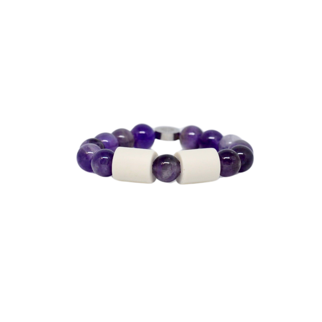 Siliconband, Ametist pärlor samt signaturpärla i metall. Fritt från nickel, bly och kadmium.
