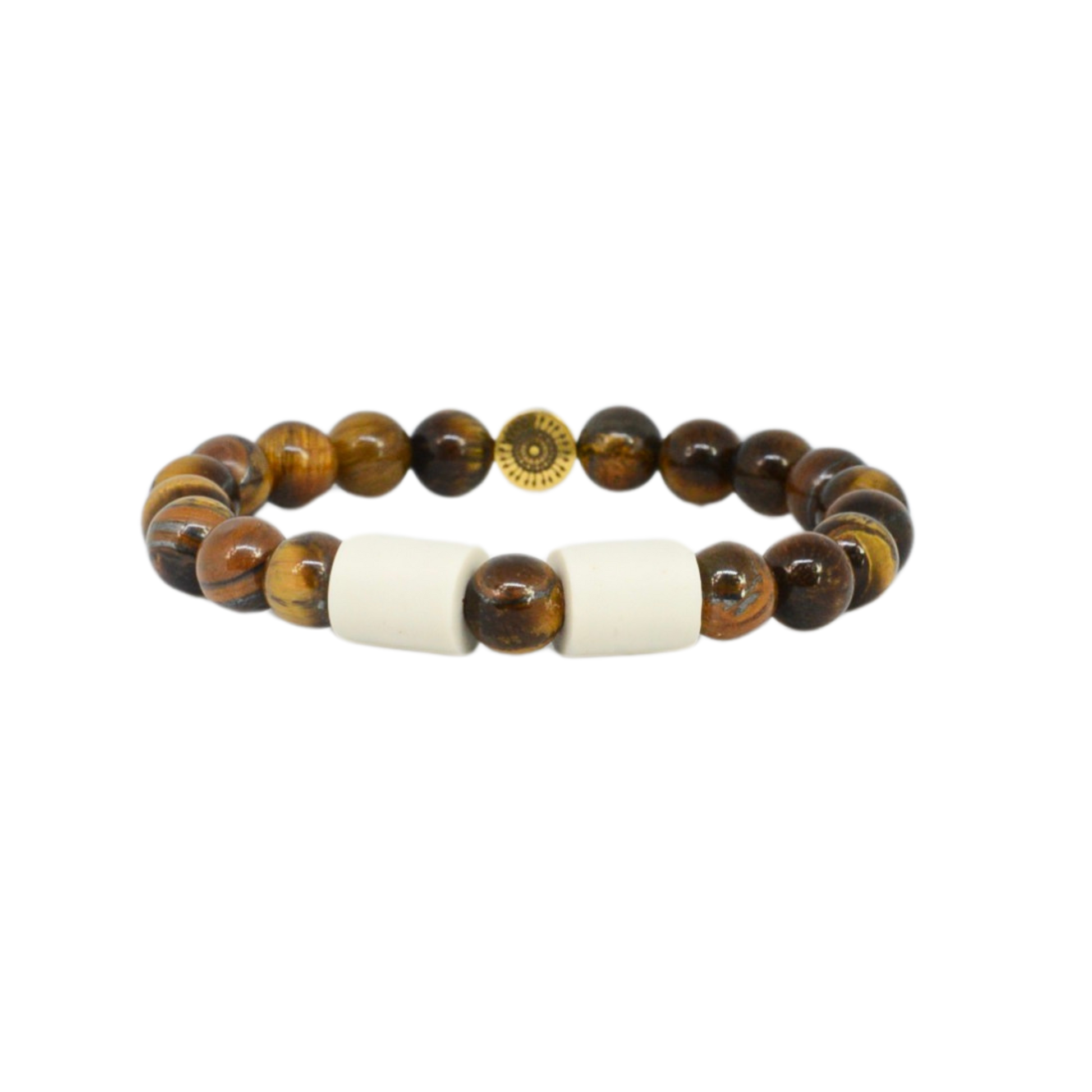 Material: Naturpärlor av Kibushi-lera jäst med EM, siliconband, pärlor av Tigeröga samt signaturpärla i metall. Fritt från nickel, bly och kadmium.