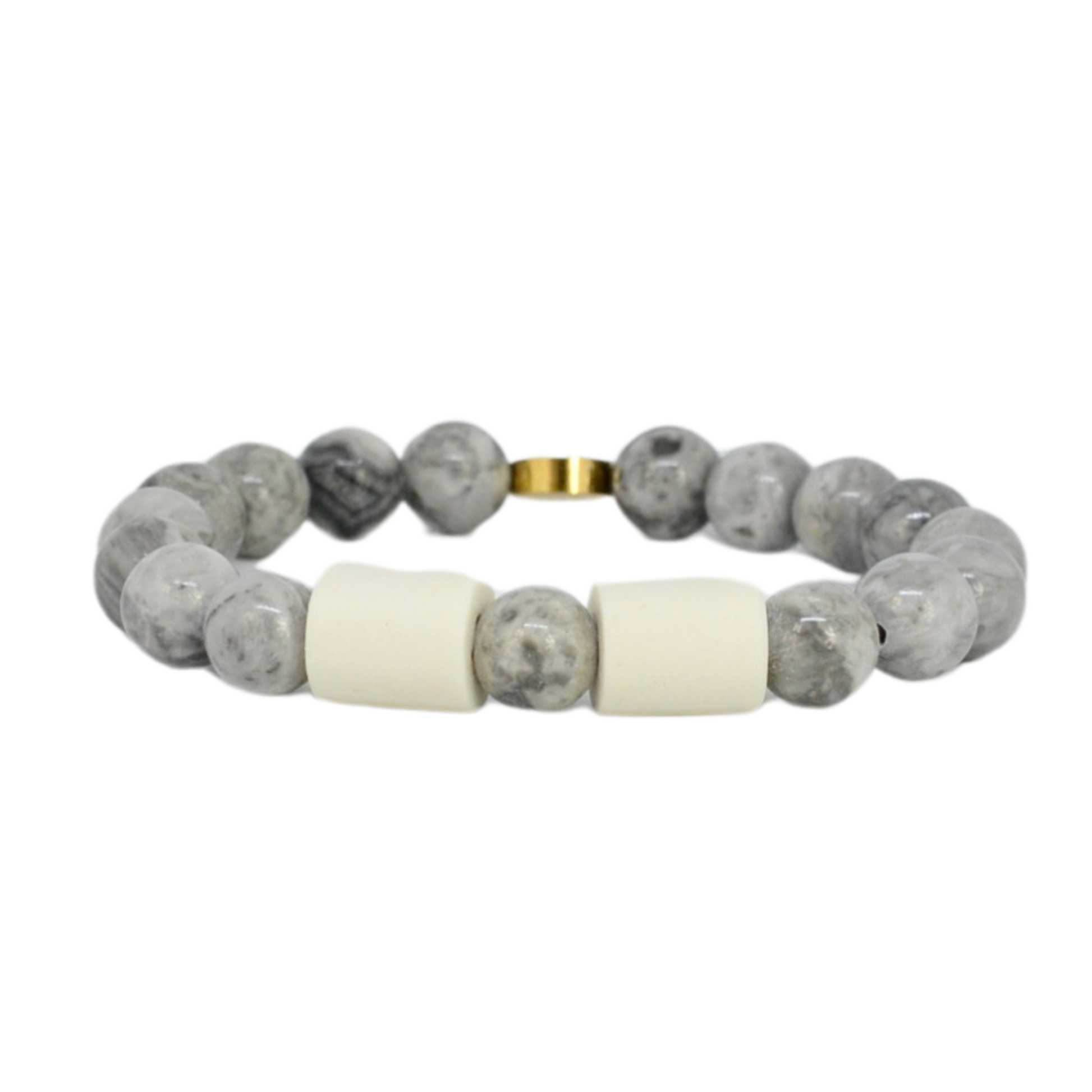 Material: Naturpärlor av Kibushi-lera jäst med EM, siliconband, Grå jasper pärlor samt signaturpärla i metall. Fritt från nickel, bly och kadmium. Pärlorna sitter på ett starkt siliconband, som gör att armbanden är lätta att ta på och av.