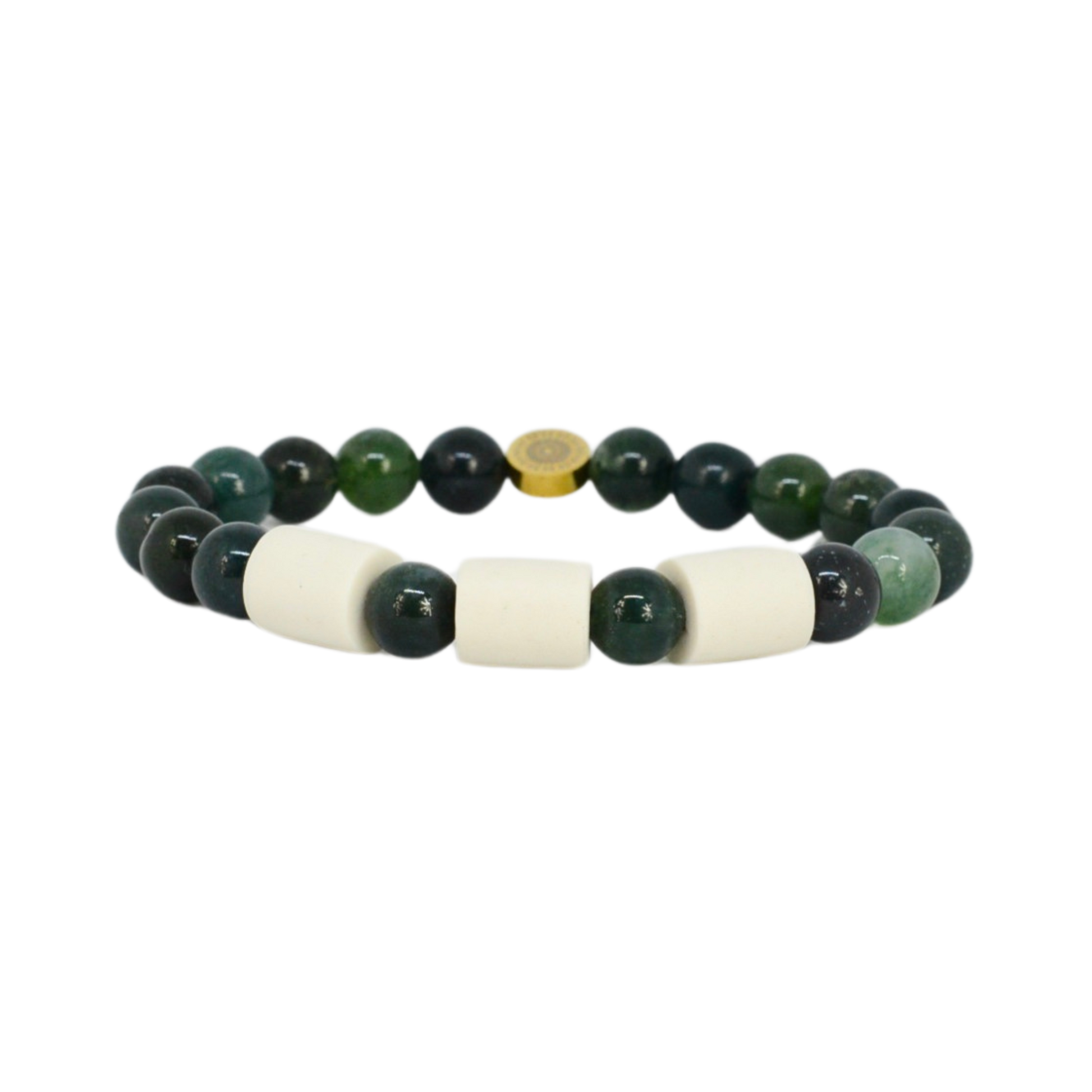 Styrka: 2–3 aktiva naturpärlor Material: Grön agat, naturpärlor av Kibushi-lera jäst med EM, signaturpärla i metall Färgtema: Grönt, vitt och metallisk accent