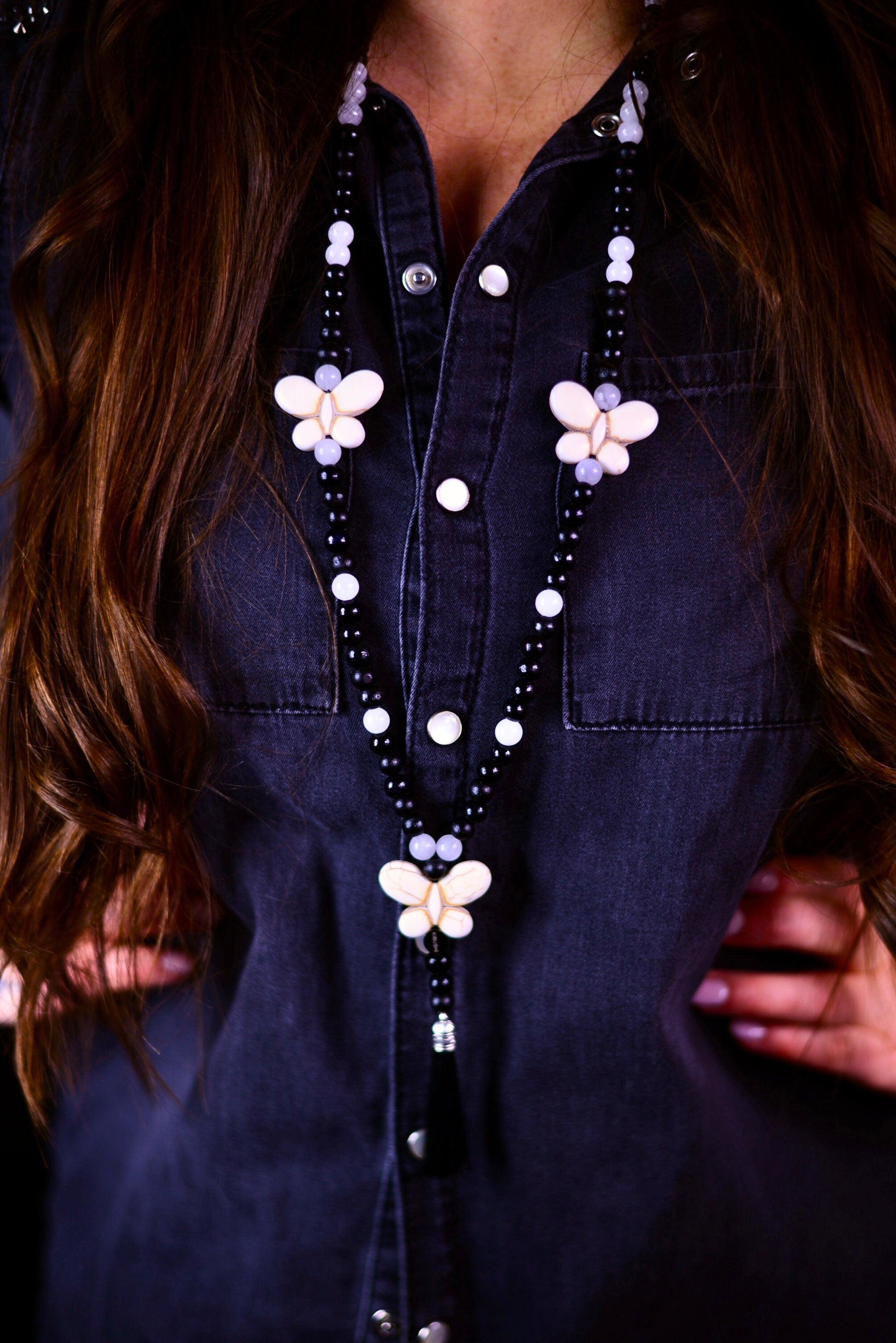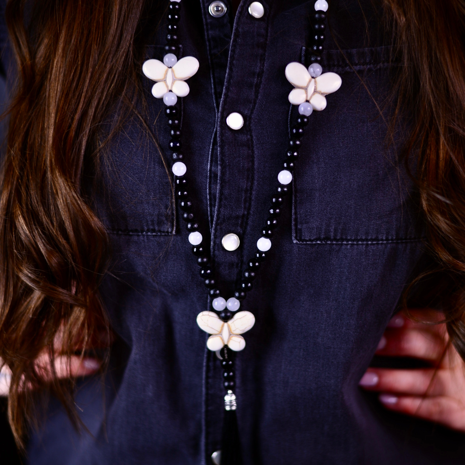 Halsbandet är gjort av svarta träpärlor i kombination med 14 Japanska naturpärlor och bergkristall. Det pryds av tre vackra fjärilar i keramik. Halsbandet är handgjort i Sverige av oss på Kibushi, med omtanke i varje detalj. Det är lätt att ta av och på över huvudet och mäter cirka 90 cm i omkrets.