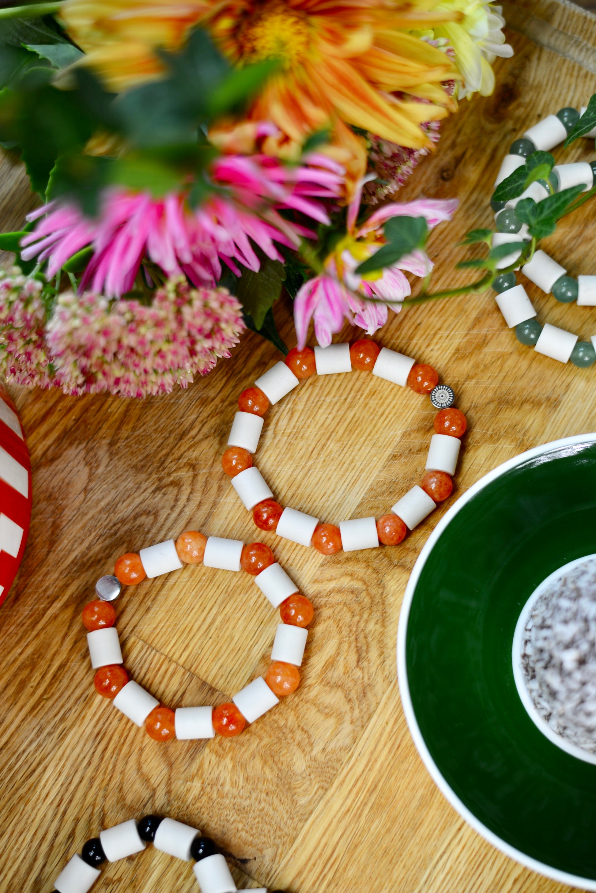 Material: Orange kalcedon (10 mm), 8–11 naturpärlor av Kibushi-lera, bergskristall, signaturpärla i metall
